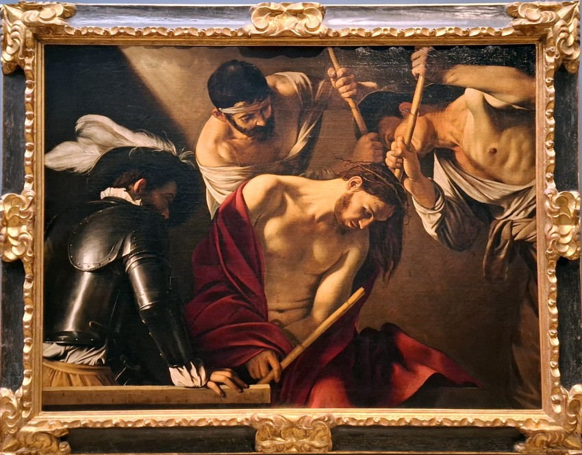 A Töviskoronázás című festmény merész képkivágása egészen különleges, hiszen sem Krisztus, sem a pribékek alakját nem látjuk teljesen. A Megváltó előre hajló alakján és arcán tükröződik a szenvedés. A képen a sárgás testszíneken kívül a vörös köpeny a meghatározó, a mártíromság jelképe.