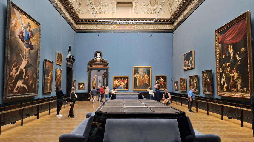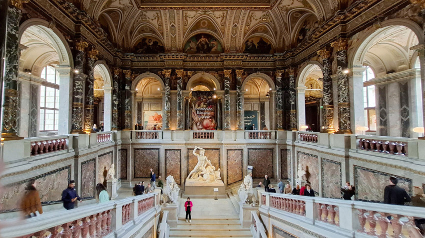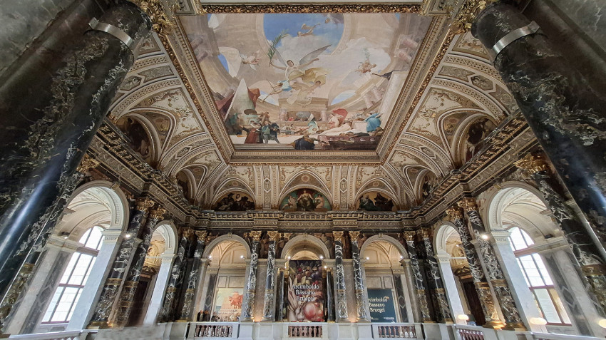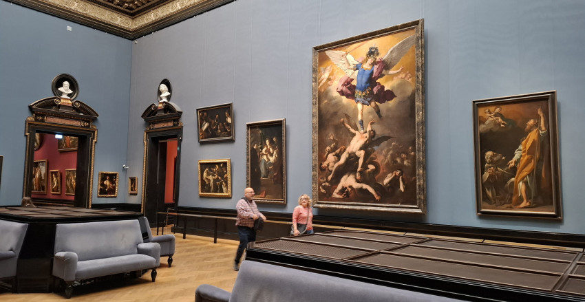 Mielőtt belépünk a képek közé az első emeleten, mindenképpen érdemes benézni a rendkívül magas kupolába, amely alatt népszerű kávézó működik. Itt domborművek, portrék, harsonás angyalok, ívelt erkélyek és girlandok tucatjai alatt pihenhetnek a látogatók kávézgatva, tortaszeletet vagy rétest majszolgatva.
