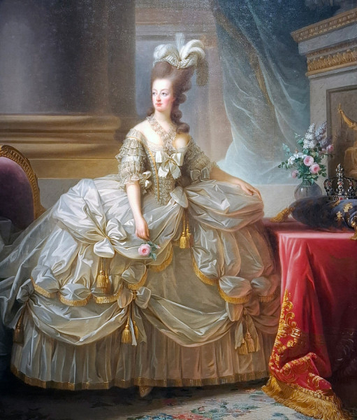 A szomszédos falon nem kerülheti el a látogató figyelmét egy óriási vászon: Marie Antoinette francia királyné monumentális portréja 1778-ból. A képet Marie Louise Élisabeth Vigée-Lebrun festette, muszáj szólnunk pár szót róla és alkotásáról. Az előkelő modell szinte elvész az épületes hajkorona és a sok ruharedő között, a kép a féktelen gazdagság és pazarlás szimbóluma is lehetne. Lebrun, aki fiatalkori önarcképei alapján jókedvű, vidám festőnő lehetett, rendkívül nagyvonalú ecsetkezeléssel festette meg Marie Antoinette-et. Az előkelő modell selymes ruhája leheletfinoman omlik alá, s az óriási fémkerettel kifeszített szoknyaköltemény alól alig láthatóan tűnik elő a cipője.