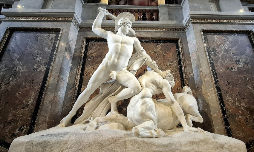 A nagy léptékhez hozzátartozik egy óriási méretű szoborcsoport is, találóan, hiszen a mű különben nem érvényesülne ennek a hatalmas térnek az optikai középpontjában. Az alkotás Antonio Canova (1757–1822) munkája, aki a klasszicizmus egyik legnagyobb szobrásza volt a dán Thorvaldsen mellett. Thészeusz legyőzi a kentaurt című carraraimárvány-faragása remekül betölti ezt a teret. A görög hős egy vastag husánggal csépeli a már földön fekvő, ember felsőtestű, négylábú kentaurt, akinek ettől kezdve biztosan nem lesz többé kedve, hogy megkísérelje elrabolni Peirithoosz lapita király mennyasszonyát. A szoborcsoportot I. Ferenc császár szerezte meg és hozatta Bécsbe 1823-ban, a jelenlegi helyére 1891-ben került. Canova művétől jobbra Ferenc József, balra pedig I. Ferenc császár szintén márványból faragott szobra fogadja az érkezőt.