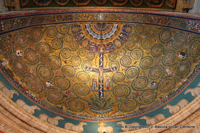 Az átrium felől belépve a Szent Kelemen-bazilikába tekintetünket azonnal magával ragadja a fenséges apszismozaik. Keletkezésének pontos ideje vitatott, de biztosan a 12–13. századok folyamán készült. Művészek egy csoportja dolgozott rajta egy mester irányítása alatt. Az ókeresztény ikonográfia szimbolikus motívumai – a kereszt mint az élet fája a négy folyó által öntözött paradicsomkertben nő – között a mozaik középpontjában ott látható Krisztus a kereszten. A kutatók azt feltételezik, hogy a jóval korábbi altemplom apszisát díszítő mozaikot állították helyre és dolgozták át a középkorban felépült templom mozaikképén – innen ered a korábbi és újabb motívumok együttes alkalmazása.