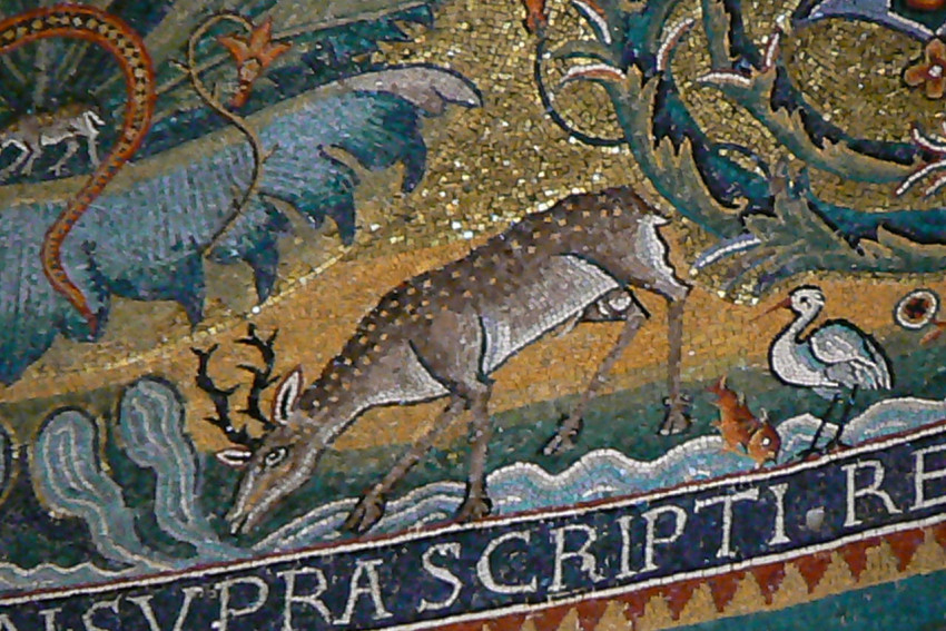 A mozaikkép gazdagon díszített részletei között sok kedves madárfészek-ábrázolás is található, a 4–5. századi ikonográfia jellemző figurái, a megváltott lelkeket jelképezik a paradicsomi örömben. A dekoratív motívumok között láthatunk szép lámpást és csordultig teli gyümölcsöskosarat is.