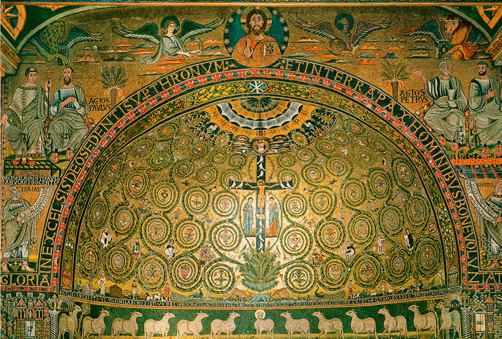 A szőlőtőt valójában egy nagy akantusz bokor jeleníti meg, amely buján sarjad ki a Krisztus vére által öntözött földből és indáival átszövi az egész apszist. A kacskaringózó ágak között hétköznapi jeleneteket látunk, annak jeleként, hogy az egész emberi nem, a teremtés minden megnyilvánulása ebből a fából merít életet. Ez a bensőséges kapcsolat Krisztus és a teremtett világ között az oltáron bemutatott szentmiseáldozatban jelenik meg számunkra, ami éppen a mozaikkép alatt van. A mozaikon ábrázolt misztérium az oltáron valósággá válik.