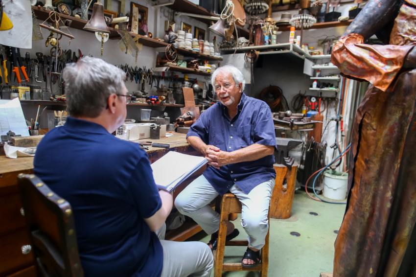 – A tűzecsetet, azaz a hegesztőpisztolyt a kezemben tartva ámulattal figyelem, hogy a tűz, míg lángjával az anyagot elemészti, az elmúlás szinte minden fázisában maradandót alkot, csak meg kell örökíteni a pillanat varázsát. Ellestem, hosszan tartó keserves munkával megtanultam, hogy az adott pillanatban a tűznek azt tudjam parancsolni: „eddig és ne tovább”. S akkor ott áll előttem a hirtelen ellobbant tűz utolsó lángnyelveivel és azok hőjével mint utolsó „ecsetvonásokkal” megfestett, megalkotott mű: a szoborkép. A fém, a vörösréz a kihívóm. Nemes harcot vívtam és vívok vele, hol én győzök, hol ő, de minden győzelmemet