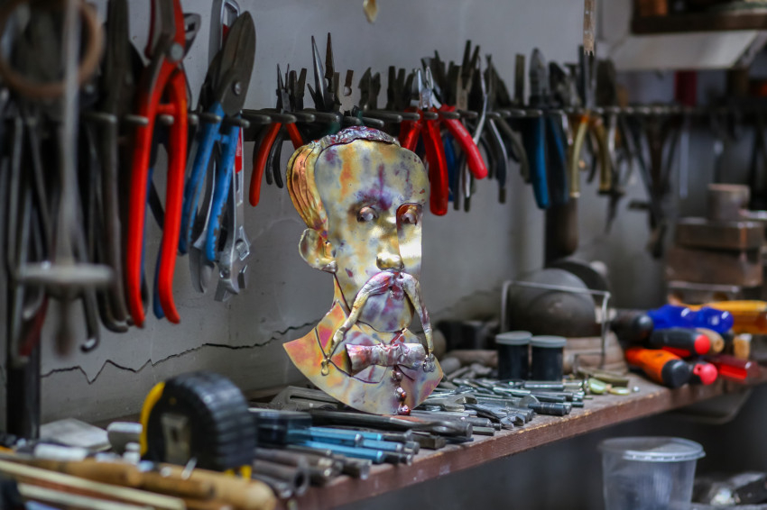 – Ez különleges eljárás. Rájöttem, hogy amikor a rézlemezt hegesztem, egy adott helyen, a hegesztett ponton túli részen egy szín, színskála mutatkozik. Arra gondoltam, ha a rézlemezt felpolírozom, akkor ezek a színek a melegítéstől talán erőteljesebben jönnek elő. Így is volt. A szivárvány összes színe benne van a rézlemezben, s a melegítéssel elő tudom hozni, mikor melyiket szükséges. Eleinte még nem tudtam ezt koordinálni, később aztán a sok gyakorlat során rájöttem arra, hogy mikor melyik szín jön elő a rézlemezből. Tűzecsetnek a hegesztőpisztolyt nevezem. Örömmel csinálom ezt. Különleges az eljárás, már csak azért is, mert nagyon, de nagyon tudni kell, hogy mennyi ideig hagyhatom hő alatt az anyagot.
