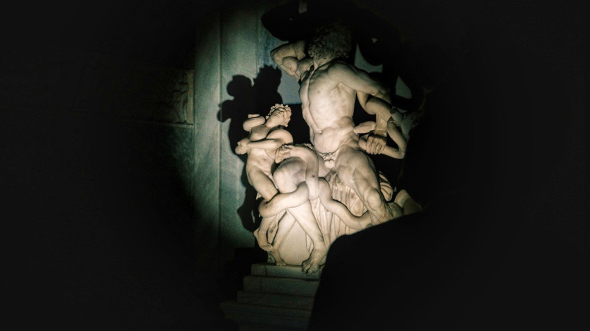 Folytatja az utat azokhoz a szobákhoz, melyekben egykor Leonardo da Vinci dolgozott. Még sötét van, zseblámpája fénye meg-megvilágítja a freskók és szobrok egy-egy halhatatlan szépségű részletét, felfedve olyan titkokat és részleteket, amelyeket nehéz észrevenni fényes nappal, amikor tele a múzeum látogatókkal – ilyen például Laokoón behajlított karja, azon a szoborcsoporton, amely 1506-ban a pápai gyűjtemény kiindulópontját jelentette, és amelyet Michelangelo szinte szóról szóra idéz Krisztus alakjában a Sixtus-kápolna Utolsó ítéletében.