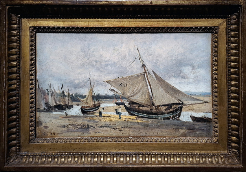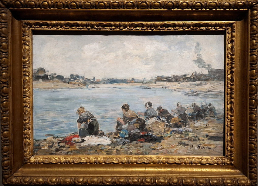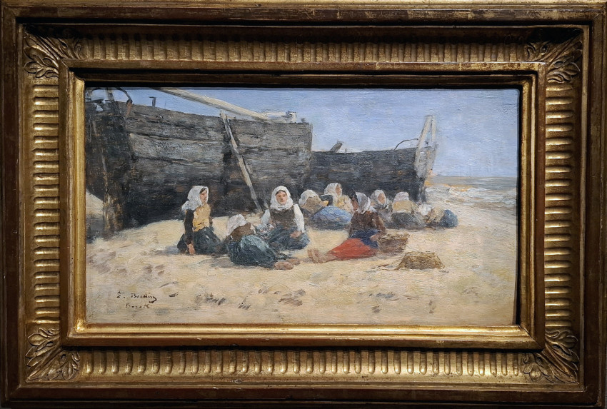 Eugène Boudinről érdemes még megjegyezni annyit, hogy Normandiában született egy hajóskapitány gyermekeként, és festményeihez gyakran keresett témát a francia partokon. Az egyik képén halászlányokat ábrázol, akik két testes csónak mögött keresnek menedéket a szél elől. Éppen szünetet tartanak a munkában, és láthatóan elmerültek a beszélgetésben. Ruháik színe harmonikusan illeszkedik a homokos tengerparti környezethez, csak egy piros szoknya töri meg kissé a földszínű színvilágot. A Brown házaspár 1896-ban szerezte meg az első Boudin-festményét, s negyven évvel később, 1936-ban egy árverésen vásárolták meg ezt a művet.