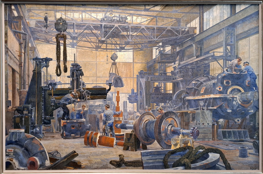 A Belvedere palotában rendezett tárlaton az első kiállított kép még nem impresszionista festmény, hanem nagyon is realista: egy gyár belsejét láthatjuk, a Brown Boveri Company mannheimi turbinagyárának üzemcsarnokát, Heinrich Kley alkotását (1920). A gyár a Brown házaspár tulajdonában volt. A művész az ottani nehézgépeket és a munkásokat ábrázolja nagy részletességgel. Az ipari jelenetekre szakosodott Kley valószínűleg a BBC Mannheim, a vállalat Svájcon kívüli legnagyobb fióktelepe megbízásából festette a képet. Ezt a villamosmérnöki céget 1891-ben Svájcban alapították Sidney Brown testvérei, Charles és Walter Boveri. A vállalat generátorokat, transzformátorokat, elosztórendszereket és gőzturbinákat szállított a nagyvárosok villamosításához, s hamarosan az egyik legfontosabb nemzetközi csoporttá nőtte ki magát ezen a területen. (A Széchenyi-hegyi fogaskerekű vasút villamos berendezéseit is a Brown-Boveri cég készítette.)