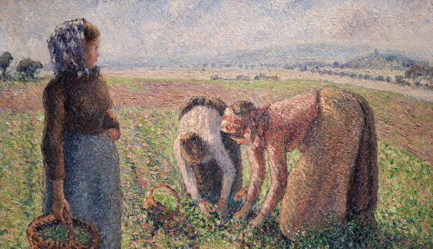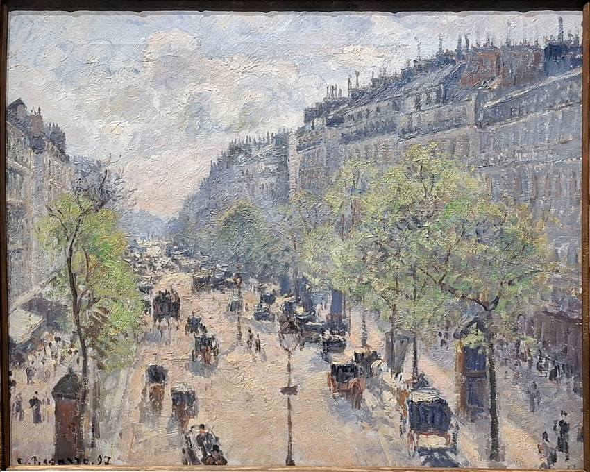 Camille Pissarro egyszer hotelszobát bérelt a Boulevard Montmartre-on, és tizennégy tájképet festett a körút forgatagáról. Hasonló volt a célja, mint Monet-nak, aki a roueni katedrálisról készített képsorozatot, megörökítve az évszakok és napszakok változásait. Pissarro apró ecsetvonásokkal és foltokkal jelenítette meg, ahogyan a hatalmas bérházak között gyalog vagy lovas kocsikkal közlekednek az emberek Párizs széles sugárútján. Még jó néhány más Pissarro-képet is láthatunk a kiállításon, tavaszi és őszi tájképeket a földeken dolgozó asszonyokkal.