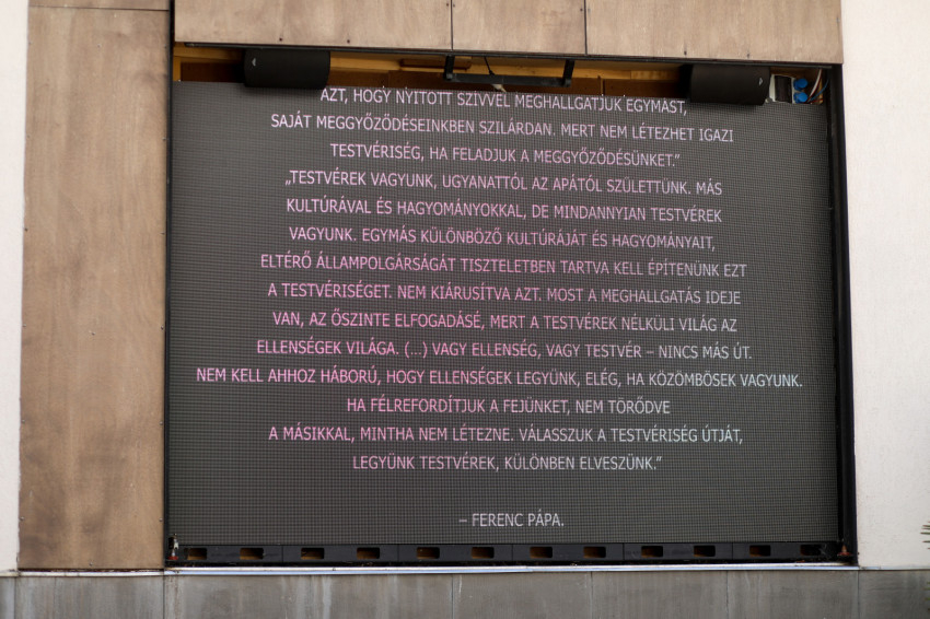 A résztvevők a Szolnoki Galériának helyet adó impozáns, a 19. század végén eklektikus stílusban épült, az ország egyik legszebb kiállítótereként számontartott egykori zsinagóga előtt gyülekeztek. A rendhagyó megnyitó keretében a szomszédos kulturális tér és irodalmi kávéház falán Ferenc pápa szavai vezettek be a kiállítás gondolatkörébe: „Vagy ellenség, vagy testvér – nincs más út. Nem kell ahhoz háború, hogy ellenségek legyünk, elég, ha közömbösek vagyunk, ha félrefordítjuk a fejünket, nem törődve a másikkal, mintha nem létezne. Válasszuk a testvériség útját, legyünk testvérek, különben elveszünk.”
