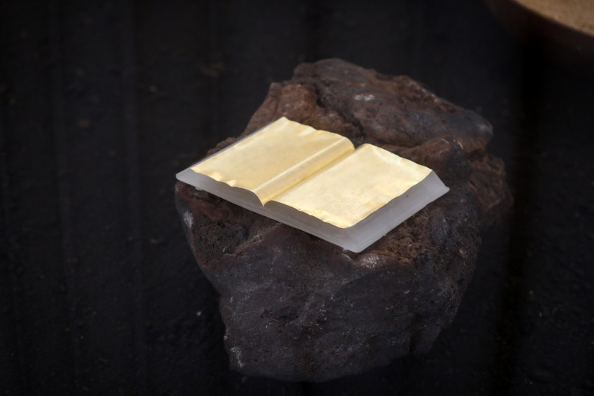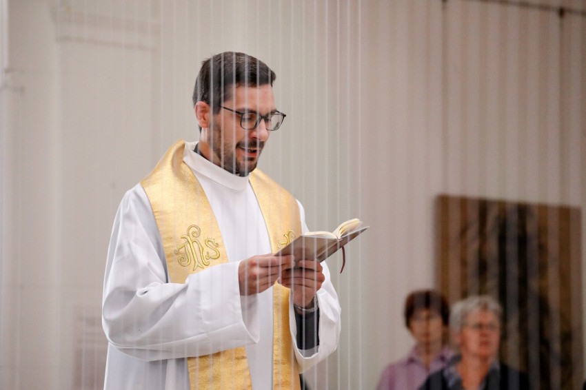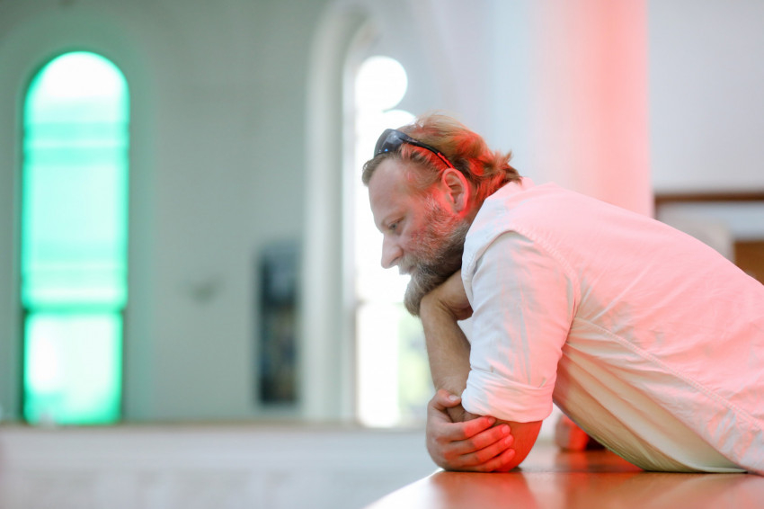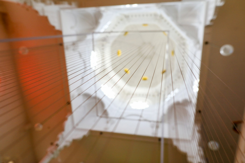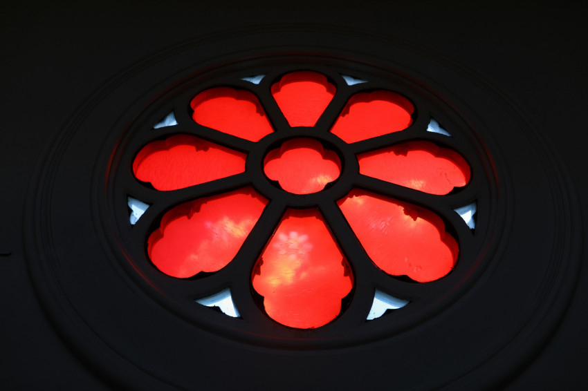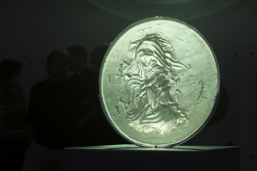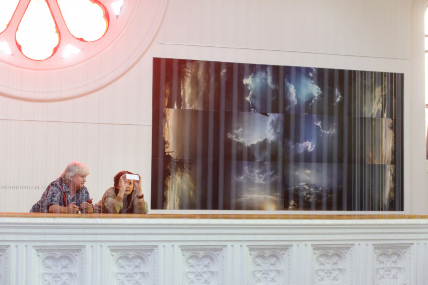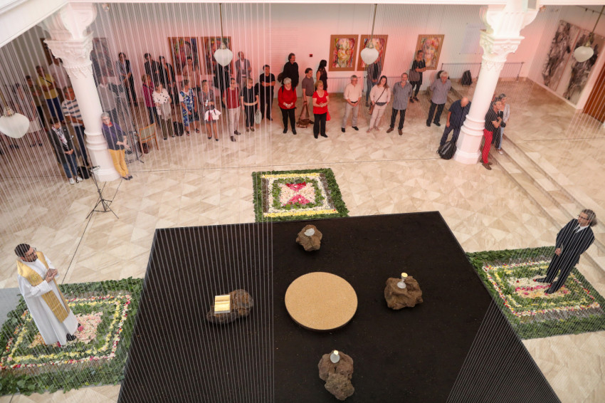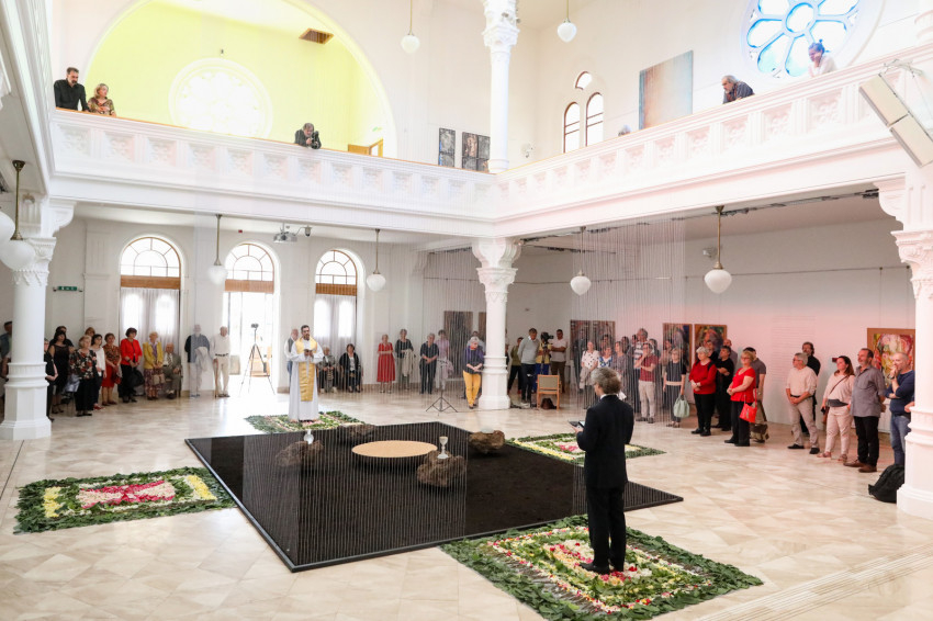 A kiállítás központi installációja az Eucharisztiára fókuszált: a padlón föld, rajta oltárkő és oltárasztal, kehely, kenyér és a nyitott könyv – az átlényegülés tere, melyre a kupola felé törve damil oldalfalakból emelték a fénytemplomot. Középen, a magasban aranykéz, húzza felfelé a tekintetet. A négy égtáj felől virágszőnyeg, nyugaton a katolikus pap, szentelését idézve arcra borulva, keleten az evangélikus teológus. Négy oldalról a rózsaablakok színt kaptak; sárga, zöld, piros és kék festi a teret. Körben festmények, fotók, plasztikák, a teremben csend, várakozás.