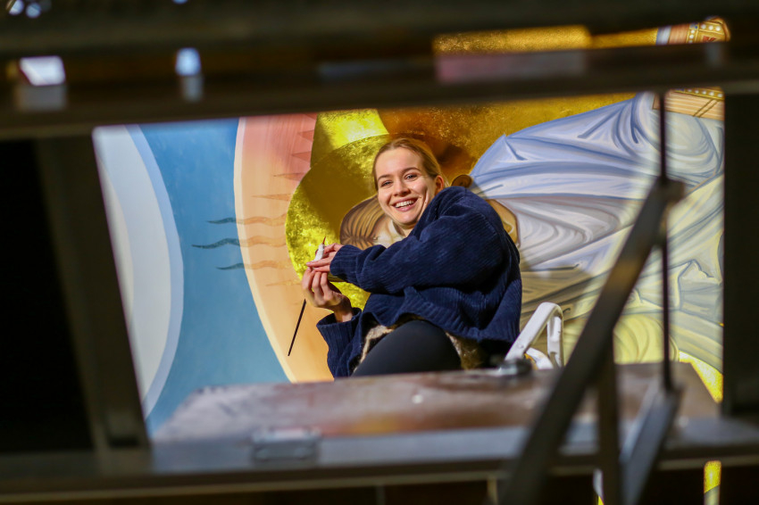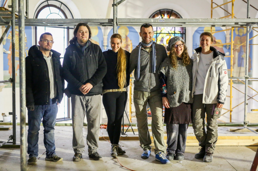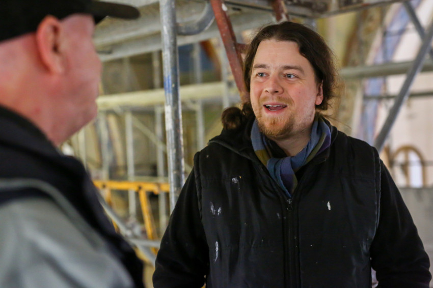A fémlétrákon felmászva, a deszkapallóktól már csak két méterre van a mennyezet, itt elénk tárulnak a keresztboltozat készülő képei. Nem könnyű áttekinteni az egészet, hiszen nincs elég távolság, nem megfelelő a rálátás a falfestményekre, melyek munkálatai lassan a végükhöz közelednek. A fotózás során ezért főleg csak részleteket lehetett megörökíteni. Az viszont jól látható a képeken, hogy egy mosolygós, jókedvű, fiatal munkacsoport dolgozik ezen a hosszú ideje tartó projekten.