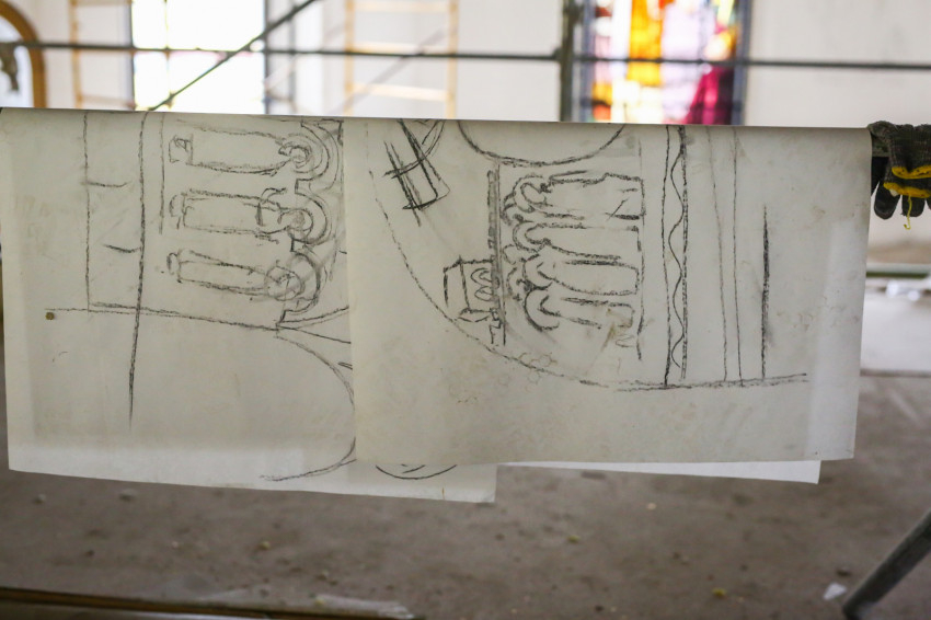 „Úgy indult az egész munka, hogy a tervezett képekhez akvarellvázlatok készültek, méretarányosan lekicsinyítve. Ezeket a vázlatokat kellett egy tervbizottság elé vinni, s az állami szervek elé is, hiszen műemlék a templom. Részint ezek, részint pedig az egyházművészeti bizottság döntött arról, hogy a terv jó-e vagy nem. Az akvarellvázlatok itt fenn vannak mindenfelé az állványokon, ezek alapján festjük a képeket. Kartonok most nem készültek, a falakra szénnel rajzoltuk fel a figurákat, csak a díszítőmotívumokhoz kellenek sablonok” – avatott be bennünket a műhelytitkokba Seres Tamás.