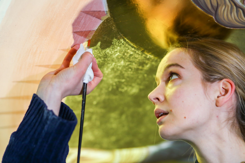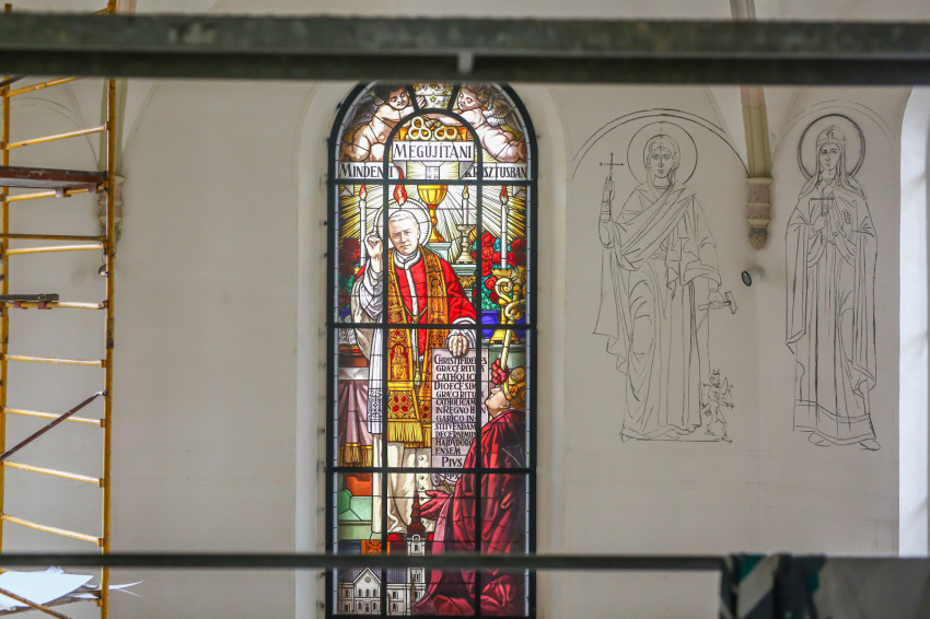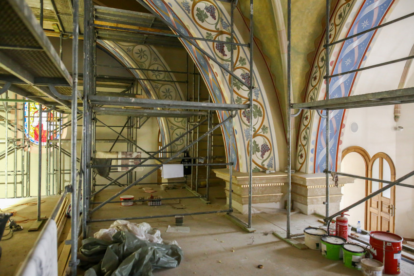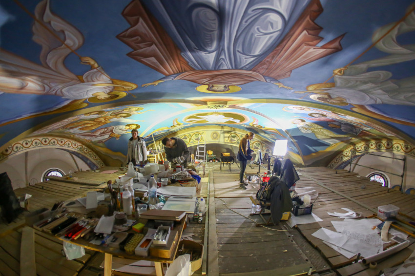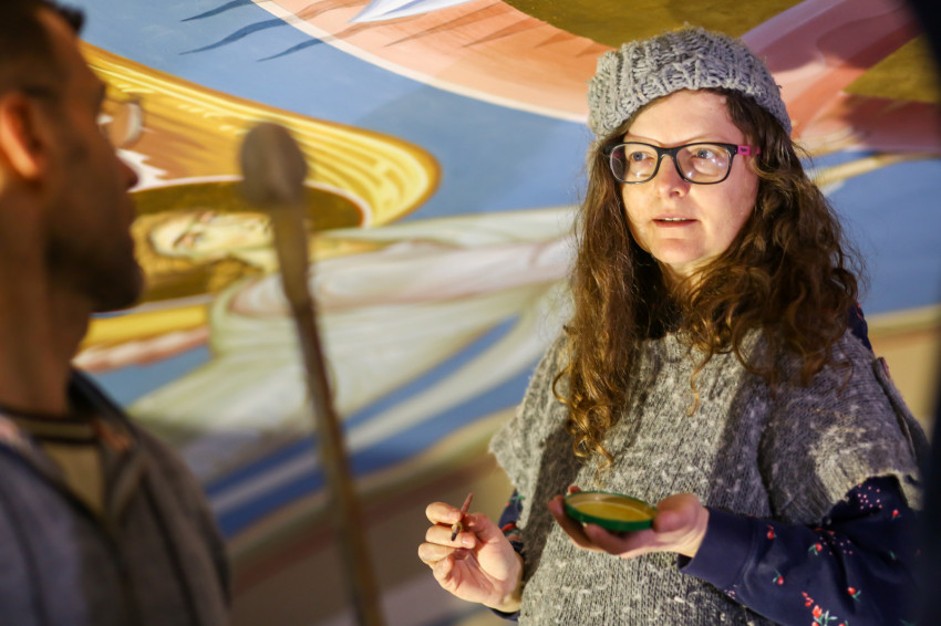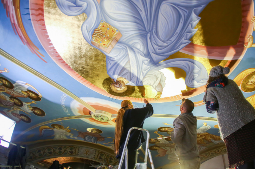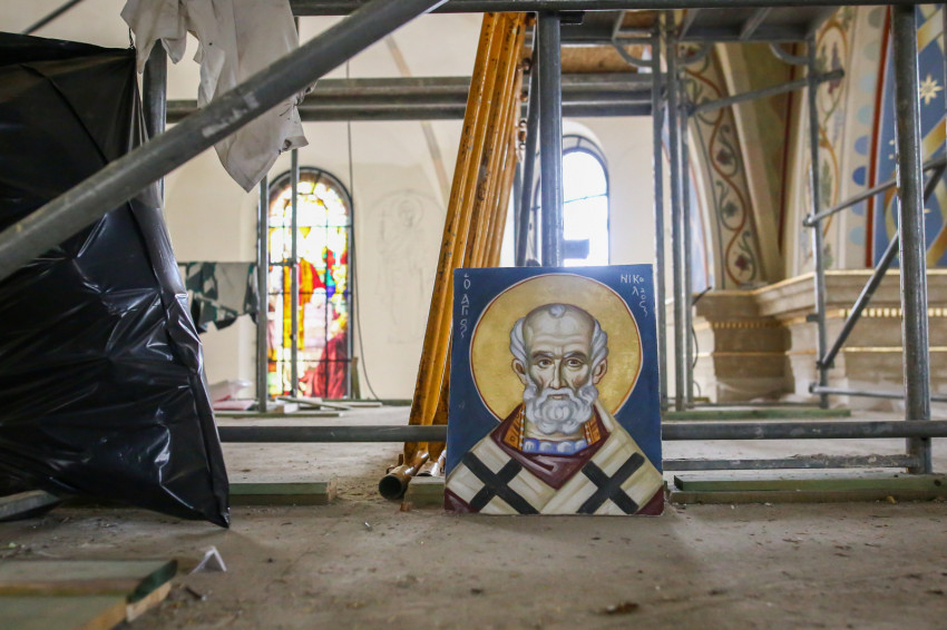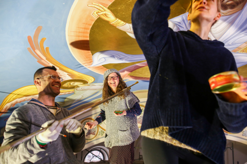 Éppen ezért felkapja az ember a fejét, ha egy templomban, ahol addig egyáltalán nem volt falfestmény, egyházi megrendelésre kortárs művészek dolgoznak a korábban üresen hagyott falfelületeken. Ez történik most a nyíregyházi görögkatolikus Szent Miklós-székesegyházban, ahol teljes körű felújítás zajlik: a fémcsöves-deszkapallós állványokon fiatal festőket, művészeket látni, akik serényen dolgoznak az azelőtt festetlen falakon.