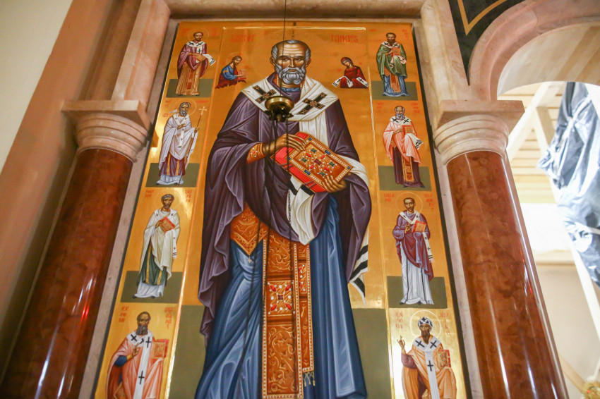 Tulajdonképpen ez a Pantokrátor képe, vagy legalábbis arra utal. Van ugyanis egy olyan kapcsolódási pont, hogy valamikor réges-régen valóban a mennybemenetel jelenetei kaptak helyet a kupolákban, oly módon, hogy a tamburon (kupoladob) oldalt álltak az apostolok, és középen volt a mennybe menő Krisztus alakja. Később ez némileg változott. Tulajdonképpen itt egy nagyon ősi képi program került fel a falra. Aztán elrendeztük a többi oldalfal programját. Lent, ha szemben állunk az ikonosztázzal, tőle jobbra Krisztus születésével indul majd a képsorozat, és egészen a feltámadásig tart, azzal fog befejeződni a túloldalon. Ehhez kapcsolódik majd a többi kép, az egyik oldalon Krisztus megkeresztelkedése lesz fenn a boltozaton, lent a kánai menyegző, a születés mellett. A világba érkezik az Üdvözítő, megteszi az első csodáját, a Szentháromság kinyilatkoztatja magát, és ez így tulajdonképpen egy ünnepkör.”