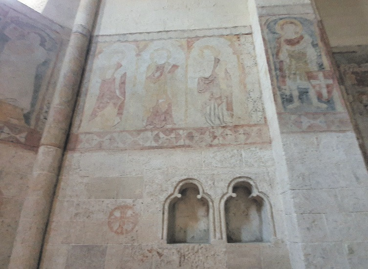 Lássuk tehát az 1995 óta méltán Europa Nostra-díjas szent hajlék néhány, a nagyközönség számára az itteni Mária megkoronázása-, Szent György- és Szent Miklós-freskóknál jóval ismeretlenebb kincseit. Számomra, talán az elmúlt másfél esztendő sokunk lelkében nyomot hagyó sebhelyei miatt, az első igazán megszólító erejű leckét azok a szürke mészkőből és vörös homokkőből lévő építőkövek adták, amelyek, anyaguk függvényében, halványabb és erőteljesebb szablyanyomokat őriznek a templom körül zajló egykori csatározások emlékére.
