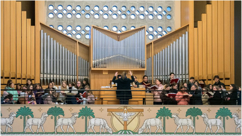 A bárányos fríz a kórus mellvédjén a pasaréti ferences templomban