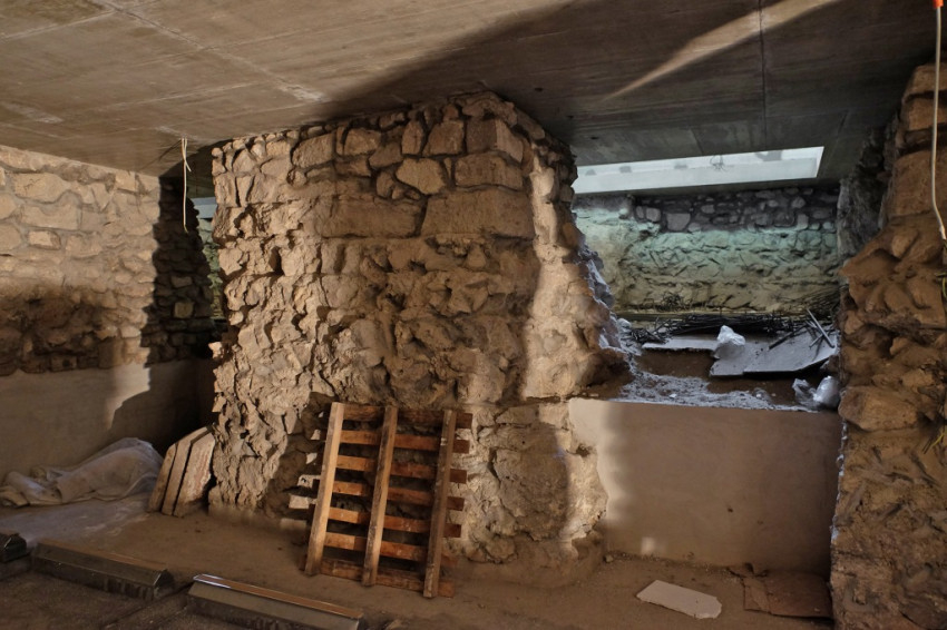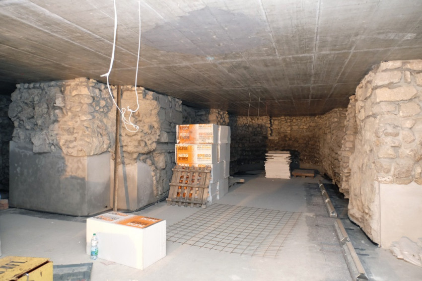 Osztie Zoltán a karzat alatti előcsarnokból induló, befejezés előtt álló lépcsősor felé invitál. Lejárat a régbe. Az egykori barokk kripta szintjére érve – egyelőre részleges reflektorvilágításban – kirajzolódik az eklektikussága miatt is izgalmas tér: „Az altemplom megnyitásával gyakorlatilag ezeréves templomunk múltja tárult fel; ezer év építéstörténetét láthatjuk itt folyamatában. Sőt, helyesebb több ezer évről beszélni, hiszen bronzkori és kelta településnyomokat is találtak. Különösen jelentősek a római kori előzmények. Kiegészültek és pontosabbá váltak a Contra-Aquincummal kapcsolatos eddigi ismereteink is. Feltárták a helyőrségi tábor egyik belső épületéhez tartozó fűtőcsatorna maradványait, amely – a román kori templom jobb oldali mellékhajójának apszisával együtt – egy üveg járófelületen keresztül fentről is láthatóvá válik.