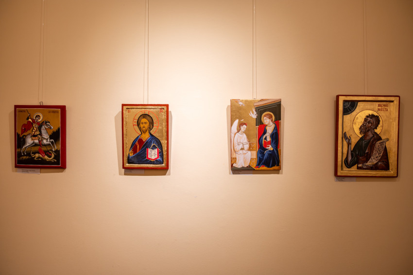 Szász Zsombor hozott eszközöket is, például egy vágódeszkát, amelyet első próbálkozásaihoz használt – anyukájától kérte el. Ő óvatos az ikonfestő szóval: saját magát például nem tartja annak, ő csak próbálkozik – mondta. Hozott hársfatáblát, melynek hátuljában ékeket helyeznek el a meggörbülés ellen; hozott aranylemezt – nem színaranyat, mert az olyan leheletvékony, hogy meg sem lehetne fogni, hanem ötvözetet. Úgy tartják, hogy ha egy pecsétgyűrűt kikalapálnának olyan vékonyra, mint amilyen az ikonfestéshez kell, nagyjából egy teniszpályányi területet lehetne beborítani vele.