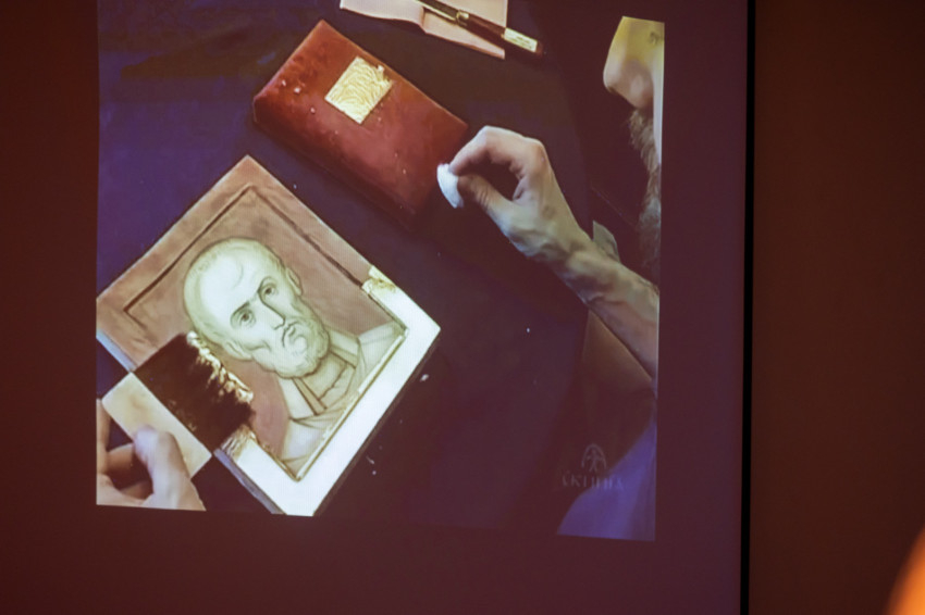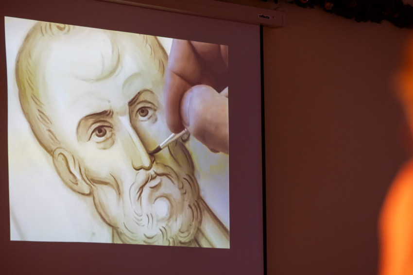 Végül Zsombor atya is vetített egy videót, amely szemléletesen bemutatta az ikonfestés folyamatát – mivel közeledik Szent Miklós ünnepe, egy róla készült ikon munkafázisait láthattuk.