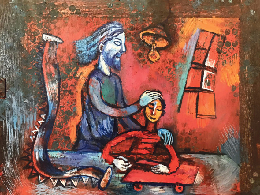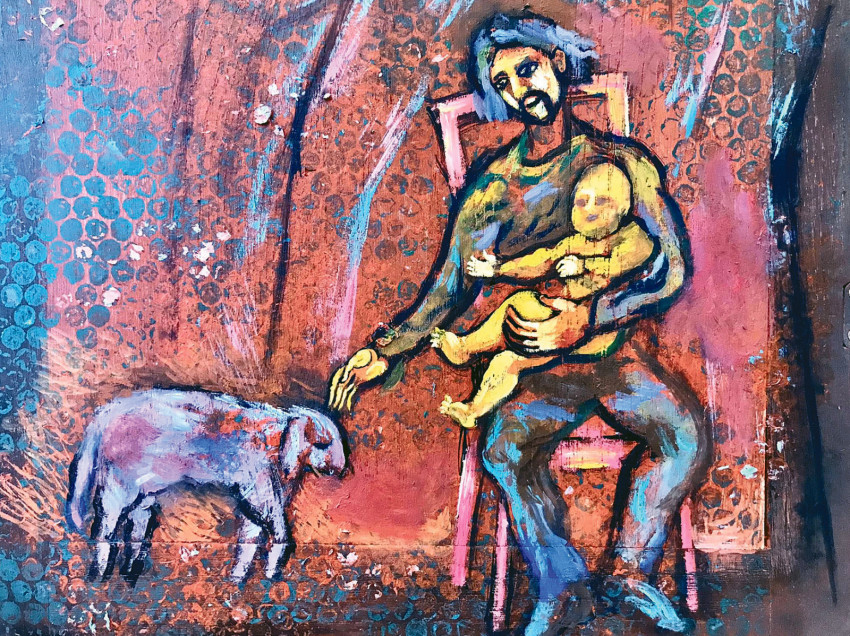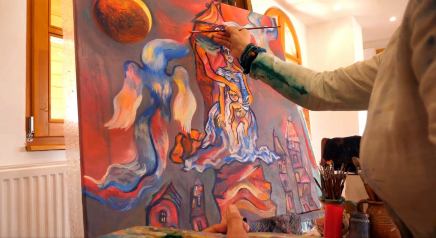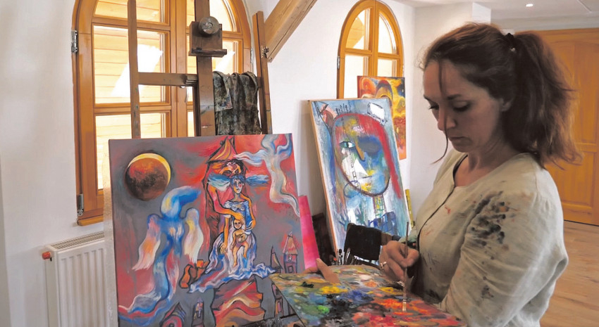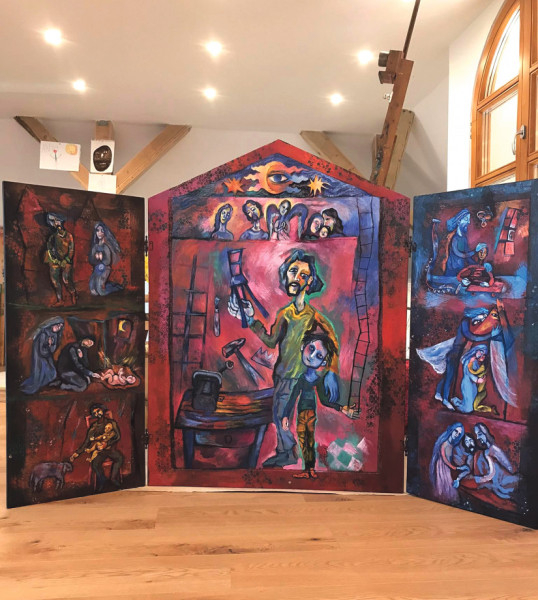 Most pedig hallgassuk magát a művészt: „A kép készítésekor a gótikus szárnyasoltárokból inspirálódtam. A téma az igazgató úr ötlete volt, mert hogy most lesznek az ünnepségek itt az iskolában. 2000 óta foglalkozom ikonfestészettel. Ennek a Szent József-képnek a fa részét is úgy készítettem elő, ahogyan az ikonokat szokás. A kép azonban sajátos eljárással készült olajfestmény, az én stílusomban. A képeken Szent József élete jelenik meg. Hat kisebb kép van a két szárnyon, a középső képen pedig Szent József és a Kisjézus a meghatározó. Még nem állították ki a festményt, most fotózzák. A szárnyasoltáron az én vizuális világom jelenik meg, Bódis Zoltán igazgató úr kérte is, hogy egyéni festői felfogásomban készítsem el a művet. Az ábrázolásokhoz olyan életképeket választottam, amelyek a diákok és a családok számára jobban érthetővé teszik Szent József életét. A képeken azt láthatjuk, ahogyan elképzelem, miként viszonyul egy apa a gyermekéhez – ahogyan Szent József a Kisjézus felé fordul, és ahogyan a családjához viszonyul. Az én világom tényleg nem az a megszokott szépség. Amiből táplálkozom, az az otthonom, ahol édesapám festett. Már gyerekkoromban kibontakozott előttem egyfajta festői világ. Megfigyelhettem, hogy az ember festőként hogyan létezik a családban, és hogyan alakul egy festmény a művész keze nyomán. Nagyon jó gyerekkorom volt, a mai napig abból táplálkozom. A képeimen látható torz alakok pedig a sajátosságaim, jellemzőek a látásmódomra. A mestereim arra tanítottak, hogy sajátos képi világra törekedjek, mert egy festő akkor érik meg, ha megtalálja önmagát az ábrázolásmódban. Képeim kicsit groteszkek, expresszívek és szürreálisak is.”