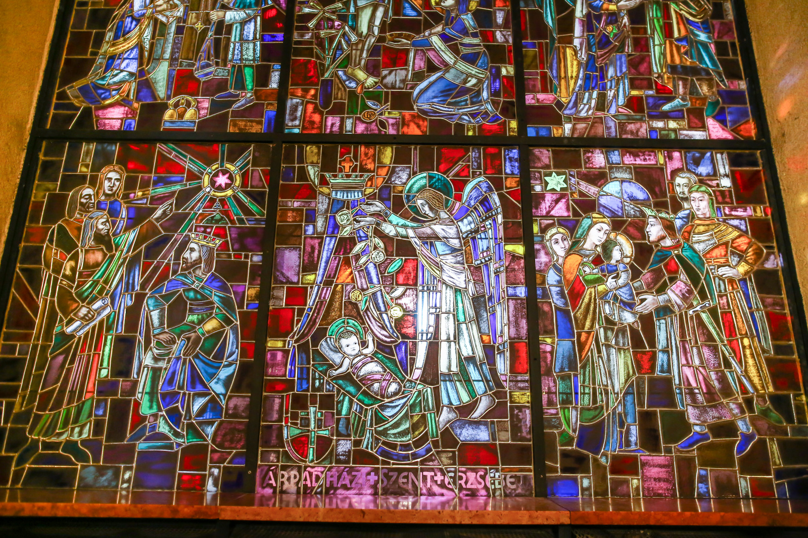 A templombelső fontos részét alkották az Árkayné Sztehlo Lili (1897–1959), a 20. századi magyarországi üvegfestészet egyik kiemelkedő alakja által tervezett színes üvegablakok: az oltárkép szerepét is betöltő szentélyablak; a 35 négyzetméteres, 18 képből álló ablak, mely Árpád-házi Szent Erzsébet életének eseményeit jeleníti meg; valamint a Mária-, a Kálvária-, a Magyar Szentek- és a bejárat fölötti karzatot megvilágító Szent Cecília-ablak.
