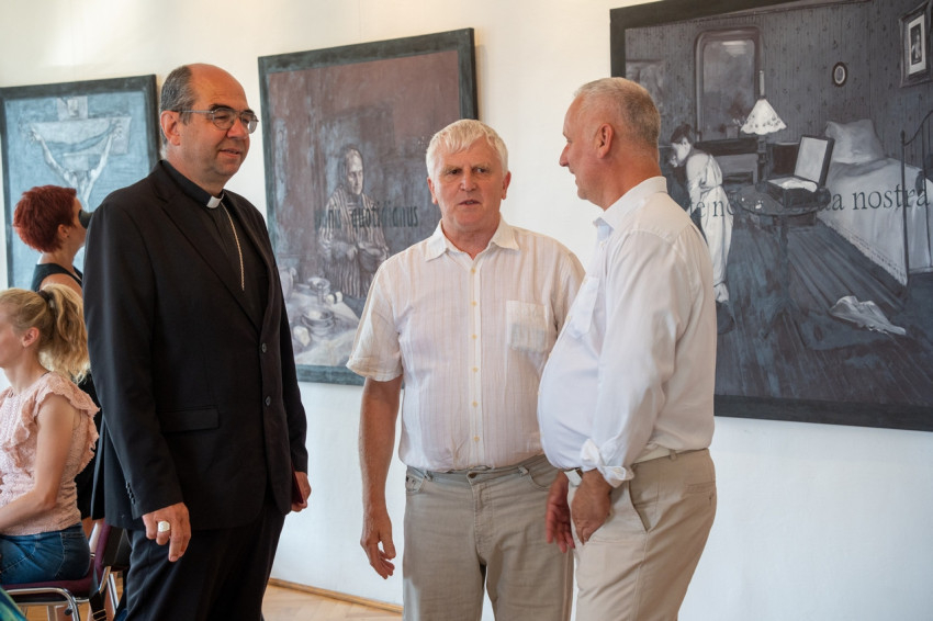 A martinus.hu szombathelyi egyházmegyei hírportálnak adott interjúban az alkotó elmondta: a tárlat számára azért is fontos, mert a Miatyánk soraira festett képeket egyben – különböző okok miatt – még nem tudta kiállítani. Több mint harminc év alatt készültek az alkotások. A monokróm színvilágú képek egy-egy ismert festőművész alkotásának újragondolásai.