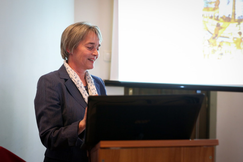 Somogyi Judit, a PPKE BTK tanára Szent Márton itáliai kultuszáról beszélt. Előadásában szólt arról, hogy milyen sok olaszországi település őrzi Márton nevét, mennyi templomot szenteltek az ő tiszteletére, hány helyen tartanak ünnepségeket november 11-i emléknapja környékén, miként kapcsolódik alakja a mezőgazdasági munkák éves körforgásához, többek közt az újbor ünnepéhez, és milyen sok népszokásban és szólásban maradt fenn az ezerhétszáz évvel ezelőtt született szent emléke. Somogyi Judit beszélt Szent Márton olaszországi ikonográfiájáról is. Mint mondta, eddigi ismereteink szerinti legrégebbi ábrázolása is Itáliában, Ravennában található, ahol a Sant’Apollinare Nuovo-bazilika mozaikjain fehér ruhában ábrázolt szentek mellett ő az egyetlen, aki színes ruhában látható mint az első nem vértanú szent.