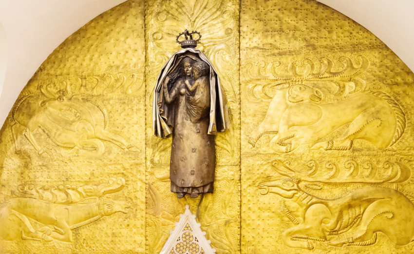 az idős Szent István király szobra tűnik fel, vállán a koronázási palásttal, jobb kezében a Szent Koronát tartva – a Regnum Marianum gondolatának kortárs kifejeződése ez a térbe kilépő kompozíció.