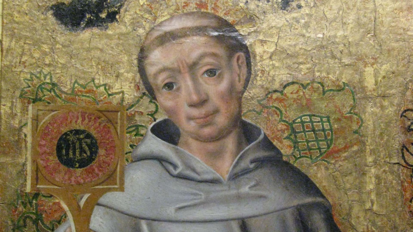 Különösen nagy volt békeszerző hatása; Jézus Nevének tiszteletével nyerte meg a szíveket. Felismerte, hogy a fegyverekkel, zászlókkal, pártjelvényekkel szemben neki egyetlen fegyvere van: az üdvözítő Jézus Krisztus. Nevének monogramját (IHS) arany betűkkel egy kis pajzsra írta, melyet kezében tartva prédikált. E pajzs hamarosan a béke és testvériség jelévé vált: házak, templomok, városházák kapuja fölé tették.