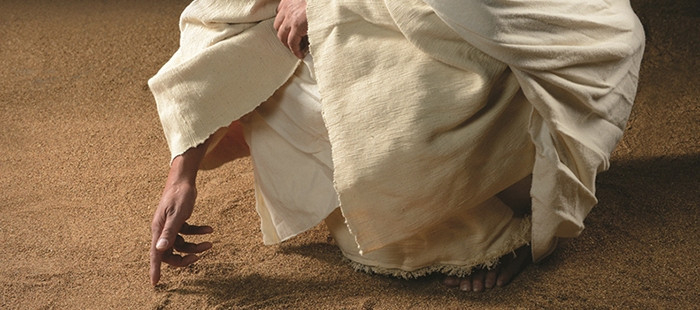 Jézus lehajolt, és az ujjával írni kezdett a földön. Ők azonban tovább faggatták. Erre fölegyenesedett, és azt mondta nekik: „Az vesse rá az első követ, aki közületek bűn nélkül van!” Aztán újra lehajolt, s tovább írt a földön. Azok meg ennek hallatára egymás után eloldalogtak, kezdve a véneken, s csak Jézus maradt ott a középen álló asszonnyal. Jézus fölegyenesedett és megszólította; „Asszony, hol vannak, akik vádoltak téged? Senki sem ítélt el?”