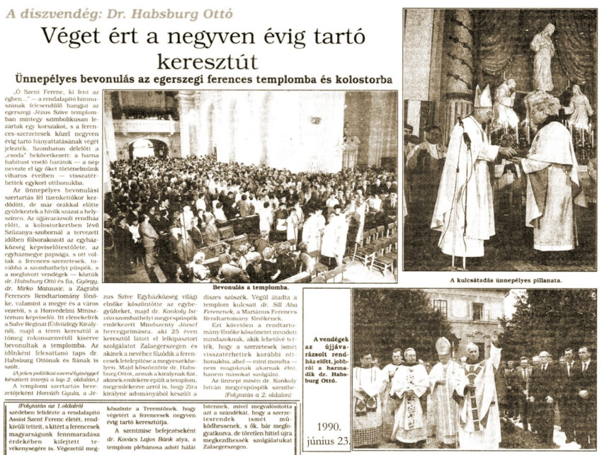 „Ó Szent Ferenc, ki fent az égben…” – a rendalapító himnuszának felcsendülő hangjai az egerszegi Jézus Szíve templomban mintegy szimbolikusan lezártak egy korszakot, s a ferences szerzetesek közel negyven évig tartó hányattatásának végét jelezték. Szombaton délelőtt a „csoda” bekövetkezett: a barna habitust viselő barátok – a nép nevezte el így őket történelmünk viharos éveiben – visszatérhettek egykori otthonukba.