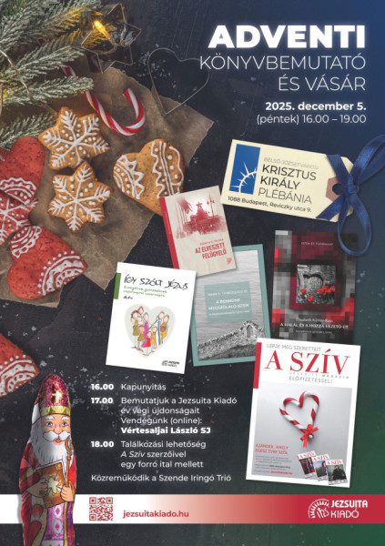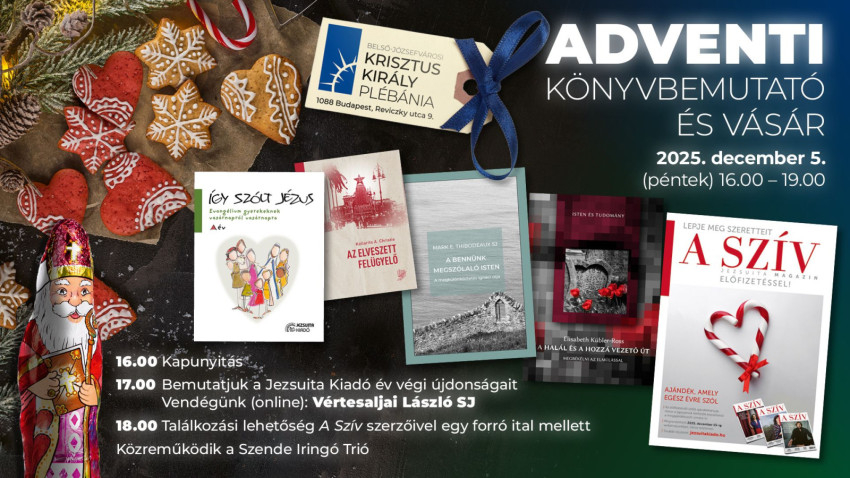 Idén is megrendezi hagyományos adventi könyvbemutatóját és -vásárát a Jezsuita Kiadó a belső-józsefvárosi Krisztus Király plébánián december 5-én délután. A vásár 16 órakor nyílik, melyen a kiadó idei könyveit 10, korábbi kiadványait 30 százalék kedvezménnyel vásárolhatják meg az érdeklődők.