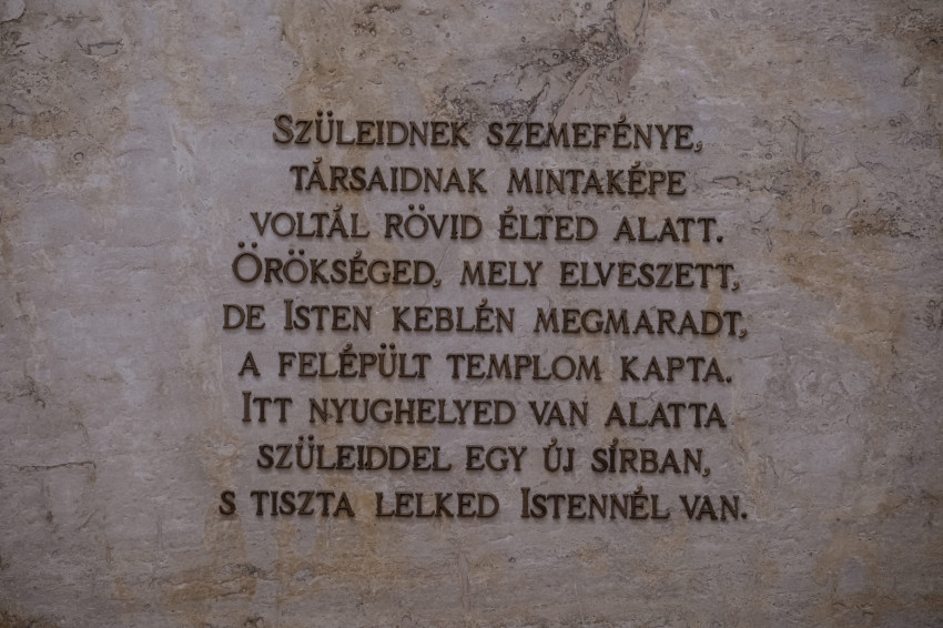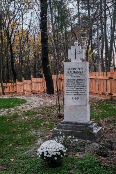 „Szüleidnek szemefénye, társaidnak mintaképe voltál rövid élted alatt. Örökséged mely megmaradt, az épülő templom kapta. Míg nyughelyed lesz alatta, addig pihensz itt a sírban, s tiszta lelked Istennél van” – olvasható Sopronyi Kálmánka síremlékén.