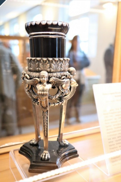 A kiállítás ezen kívül Okrutzky Erzsébet iparművész (1901–1986) munkásságával, illetve a rend számára készített megrendeléseivel foglalkozik. A kiállítás legszebb darabja egy magyar szentek zománcképeivel díszített kehely, amelyet az 1938-as kettős szentév alkalmából Barth Ferenc tervezett és Okrutzky Erzsébet készített el. Minden bizonnyal ennek a kehelynek a kapcsán fogalmazódhatott meg Tomek Vince budapesti házfőnökben, hogy milyen jó lenne, ha a különböző piarista templomokban piarista motívumokkal és piarista szentek zománcképeivel díszített kelyhekkel lehetne misézni. 1939 és 1948 között a művésznő több mint húsz megrendelést teljesített a piaristáknak, készített cibóriumokat és kelyheket a budapesti, a nagykanizsai, a sátoraljaújhelyi, a tatai, a váci és a veszprémi rendházak és templomok számára, de számos személyes megbízásnak is eleget tett.