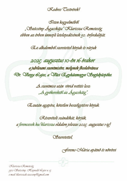 A ferencesek második rendje magyarországi letelepedése 30 éves jubileumát ünnepli idén. A klarisszák a „Szécsény Ágacskája” Klarissza Remeteségben 1995. augusztus 12-én kezdték meg újra a közösségi életet hazánkban, miután 1782-ben II. József feloszlatta a szerzetesrendeket. Az Assisi Szent Kláráról nevezett nővérek rendje a 13. századtól kezdve egészen az abolitio rendeletig fennállt, ami egyedülálló a középkori női szerzetesrendek között. A szécsényi remeteséget a franciaországi Le Rameau de Sion nővérei segítségével alapították a rendszerváltás után.