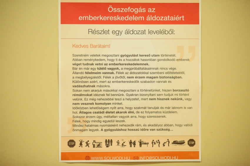 A kivetítőn a Solwodi (Solidarity with Women in Distress) logó alatt egy Ferenc pápától vett idézet olvasható: „Felebarátunk testének bármilyen megsértése, megsebzése vagy megerőszakolása a teremtő Isten meggyalázása.” A bevezetőt Sajgó Szabolcs SJ mondja. Ma van Szent Bakhita emléknapja, amely öt éve az emberkereskedelem elleni fellépés napja. A konferencia programja: bemutatkozik a Solwodi Hungary Egyesület, és Németh Ágnes rendőr ezredes jóvoltából a kérdéskör hatósági kezelése ismeretanyagáról hallunk. Ezután kerekasztal-beszélgetés következik, amely a téma érzékenységére tekintettel nem sajtónyilvános. Végül a Jézus Szíve-templomban együtt imádkozunk az áldozatokért. A Párbeszéd Háza a következő hónapokban is hasonlóan nehéz társadalmi témákat próbál feldolgozni: márciusban a dizájnerdrogokról, áprilisban a gazdagok hivatásáról, májusban a gyermekvédelemről lesz szó.