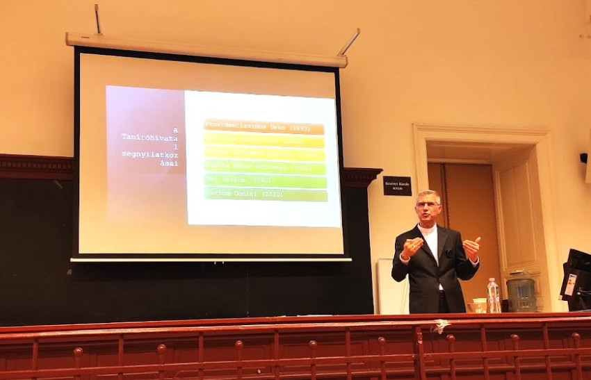 Martos Levente Balázs A Pápai Biblikus Bizottság műhelyében: katolikus bibliatudomány a II. Vatikáni Zsinat után című előadására megtelt az F épület Kerényi terme. Nem annyira egzegetikai kérdésekről fog beszélni – vezette be előadását a püspök, hanem a biblikus testület működését, történetét szeretné bemutatni; a katolikus bibliatudomány közelmúltbeli és jelenkori állásáról ejt szót.