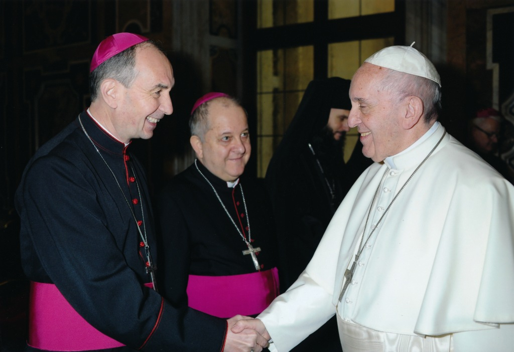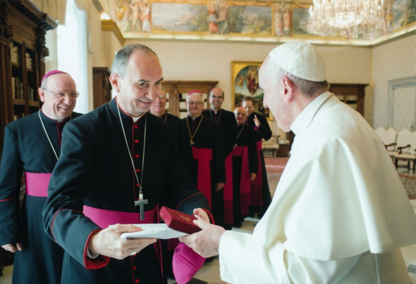 – Számomra meghatározó volt a készület ideje is. Ezt azért tartom fontosnak megemlíteni, mert az a közeg, az a környezet, vagy az a lelki felkészülés, ami aztán a tegnapi, Szentatyával való találkozáshoz vezetett, az mind befolyásolja azt, hogy hogyan értettem, értelmeztem és éltem meg Ferenc pápával való találkozásunkat. Több mint egy éve készültünk a megfelelő kérdések, kérdőívek alapján, munkatársaimat is bevonva ebbe a folyamatba. Nem gondolom, hogy nekem kellene egyedül megválaszolnom a sok kérdést, hanem úgy gondoltam, maga a felkészülés erre a látogatásra az egész egyházmegye feladata. Egészen bizonyos, hogy visszafelé is jótékony hatással van munkatársaim gondolataira, a saját munkánk értékelésére, megítélésére, illetve arra, hogy milyen kritériumok alapján szervezzük a munkánkat; milyen kritérium alapján állapítjuk meg, hogy ez jó vagy rossz irány. Ez óriási segítség volt már a felkészülési időben is. Így tehát, amikor ez az anyag elkészült, elküldtük a nuncius úron keresztül, ezt követően pedig egyre inkább fokozódott bennem a várakozás, hogyan fogunk találkozni Ferenc pápával, hiszen Jézus az ő megváltói művét az ő Egyházára bízza. Az Egyház Péter bizonyosságával a Föld különböző területein, adott körülmények között végzi a szolgálatát, így a Pécsi Egyházmegyében is. Egészen bizonyos, hogy a mi egyházmegyénk nem Isten háta mögötti hely; nem a világ közepe, de az Isten számára fontos hely, mert akarja, hogy az üdvösség műve ott is megvalósuljon. Ennek a feladatnak az élményével jöttem ebbe a találkozásba, és nagyon nagy öröm volt, hogy az ad limina látogatás első napján Ferenc pápával találkozhattunk.