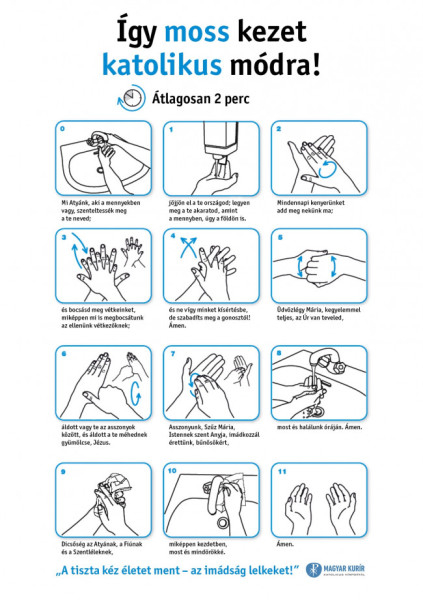 Ezalatt kényelmes tempóban el tudjuk mondani a Miatyánkot, az Üdvözlégyet és a Dicsőséget. Ehhez csak azt tudjuk hozzátenni, ami a pdf-ben közzétett grafika alján is szerepel: „A tiszta kéz életet ment – az imádság lelkeket!”