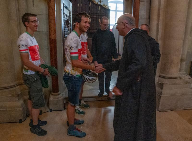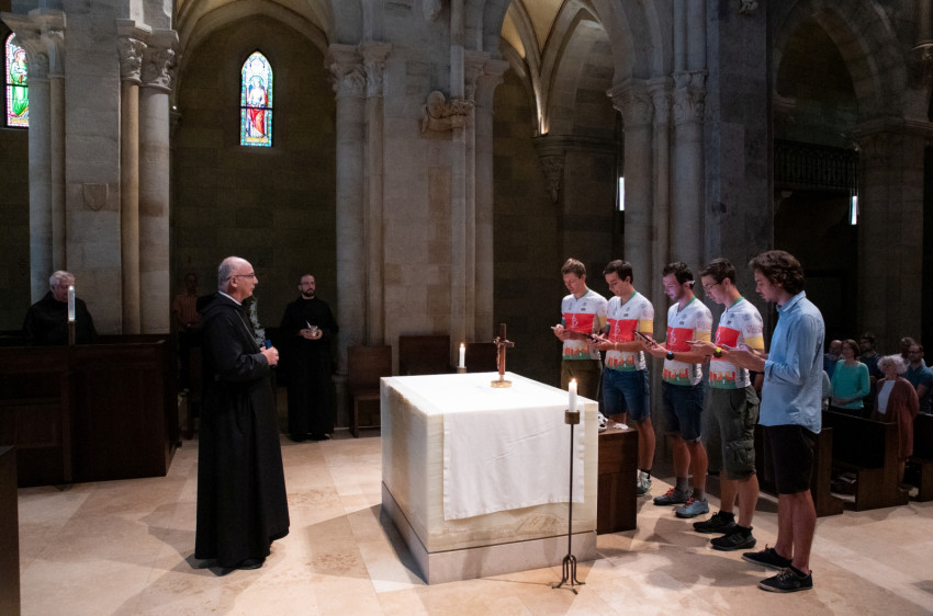 Egy-egy attribútum – Csongor a négyezer kilométeren át a biciklijén lobogó magyar zászló, Levente a kerékpáros sisakja, Andris a világtalálkozón kapott rózsafüzér, a kísérőautót vezető Áron és Barni pedig a slusszkulcs – letételével pedig jelképesen az út terhét is Isten elé helyezték, majd a bencés közösség felé fordulva, meghatódva az alábbi imával mondtak hálát: