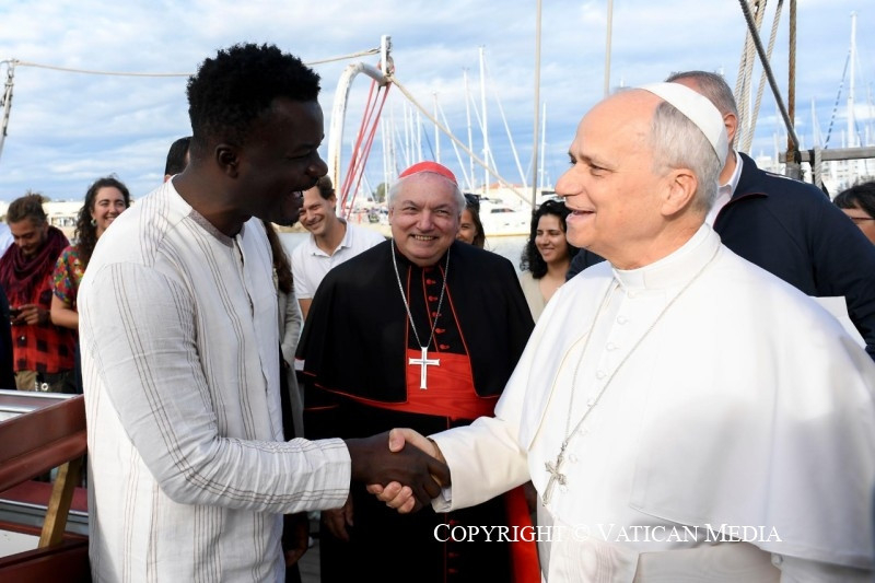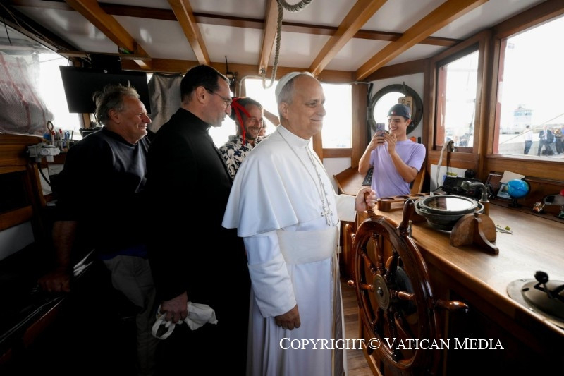 XIV. Leó pápa péntek délután a Rómától mintegy 25 kilométerre délkeletre fekvő tengerparti városba, Ostiába utazott, hogy meglátogassa a Med25 Bel Espoir legénységét, a vitorlást, amely hónapok óta járja a Földközi-tenger kikötőit, fedélzetén 25 különböző nemzetiségű és vallású fiatallal.