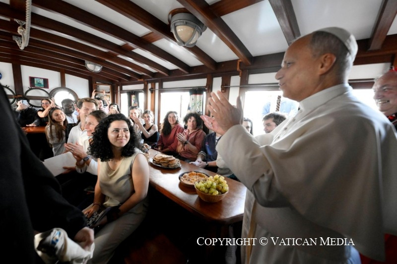 A szeles tengeri napon a hajó fedélzetén, majd a hajó gyomrában egy csésze kávé és néhány sütemény mellett Leó pápa arra buzdította a fiatalokat, hogy „tanuljanak meg béketeremtők és -hirdetők lenni egy erőszak és megosztottság felé haladó világban”.