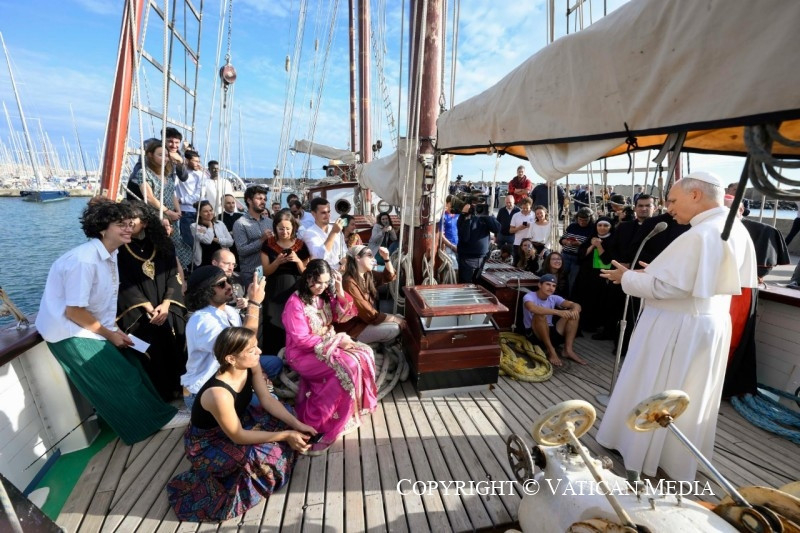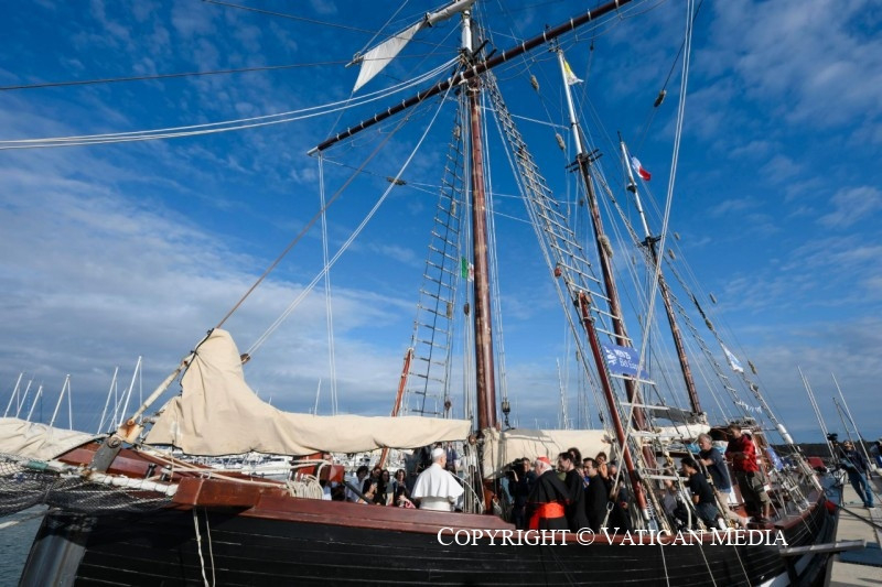A látogatásra elkísérte a Szentatyát Jean-Marc Aveline marseille-i bíboros is, akinek egyházmegyéjéből elindult a béketeremtő projekt. A pápa spontán beszédében és a fedélzeten tartózkodó fiatalokkal folytatott beszélgetésében arra buzdította őket, hogy