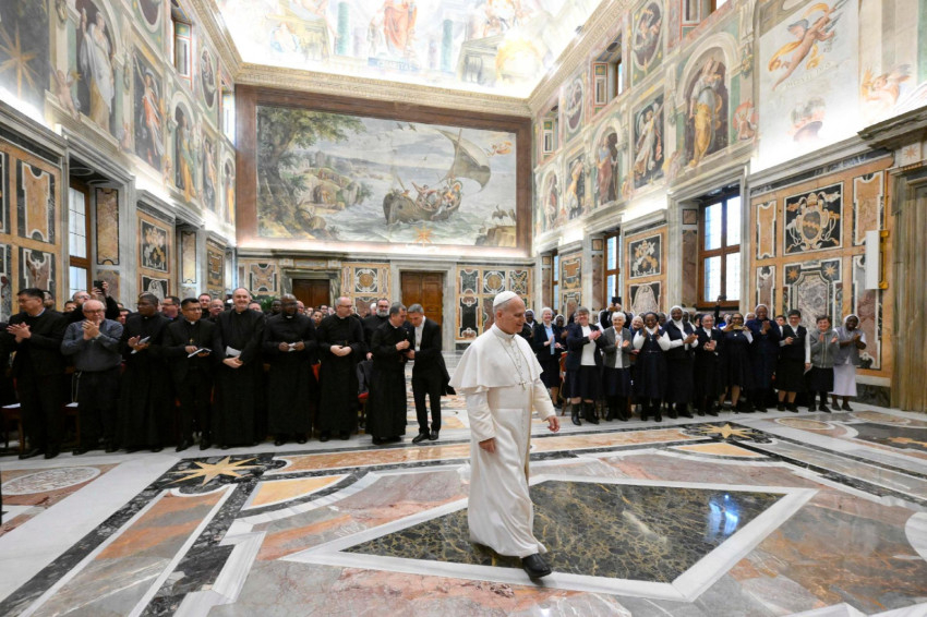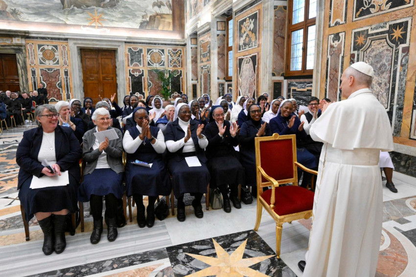 Beszéde második felében a Szentatya a Miasszonyunk Apostolai szerzetesnővérek 110 fős csoportjához fordult, emlékeztetve őket alapításuk szentírási gyökerére, amit az Apostolok Cselekedeteiben olvasunk: „Máriával, Jézus anyjával” (vö. ApCsel 1,14) voltak együtt az apostolok az emeleti teremben. Ezt a lelki közösséget Planque Ágoston atya bízta rájuk, aki másfél évszázaddal ezelőtt, 1876. május 1-jén, a franciaországi Lyonban megalapította a kongregációjukat, hogy biztosítsa a szerzetesnővérek nélkülözhetetlen jelenlétét az Afrikai Missziók Társaságának munkájában.