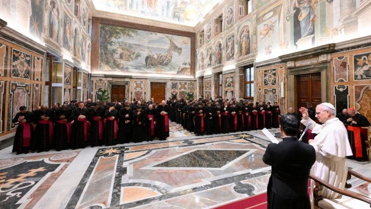 „Álljatok ellen az elszigetelődés kísértésének, és vigyetek reményt különösen oda, ahol az emberek számára hiányzik az igazságosság és a béke!” Ezt kérte a pápai képviseletek állandó munkatársaitól hozzájuk intézett beszédében a Szentatya. A pápa részletezte az Egyháznak nyújtott szolgálat sajátosságait, amelyet különösen fáradságosnak nevezett, és amely ezért „Isten iránt buzgó és az emberek felé nyitott szívet”, valamint tanulást, önmegtagadást és bátorságot igényel.