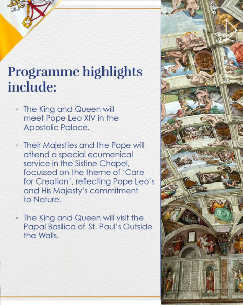 Az eredetileg áprilisra tervezett látogatás egybeesik Ferenc pápa teremtésvédelmi enciklikája, a Laudato si’ megjelenésének 10. évfordulójával is. Károly király – aki az anglikán egyház (hivatalosan Anglikán Közösség; angol: Anglican Communion) legfőbb kormányzójaként régóta elkötelezett a vallások közötti párbeszéd területén – kifejezetten kérte, hogy részt vehessen egy, a teremtett világ gondozására összpontosító liturgián is. Ezt a szertartást XIV. Leó pápa és Stephen Cottrell yorki anglikán érsek vezeti majd a Sixtus-kápolnában.