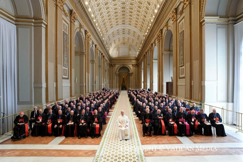 Köszönöm imáitokat és közösségeitek imáit: nagy szükségem van rájuk! Különösen hálás vagyok Zuppi bíboros úrnak, a hozzám intézett szavaiért is. Köszöntöm a három alelnököt, a főtitkárt, és köszöntelek mindannyiatokat. Az olaszországi egyház története nyilvánvalóvá teszi azt a különleges köteléket, amely összeköt benneteket a pápával, és amely – az Olasz Püspöki Konferencia alapszabálya szerint – „különleges módon meghatározza a konferenciának a római pápával való közösségét” (4. cikk 2. §). Elődeim példájához hasonlóan én is érzem ennek a „közös és különleges” kapcsolatnak a jelentőségét, ahogyan azt Szent VI. Pál jellemezte, amikor az Olasz Püspöki Konferencia első közgyűlésén felszólalt (vö. Beszéd, 1966. június 23.).