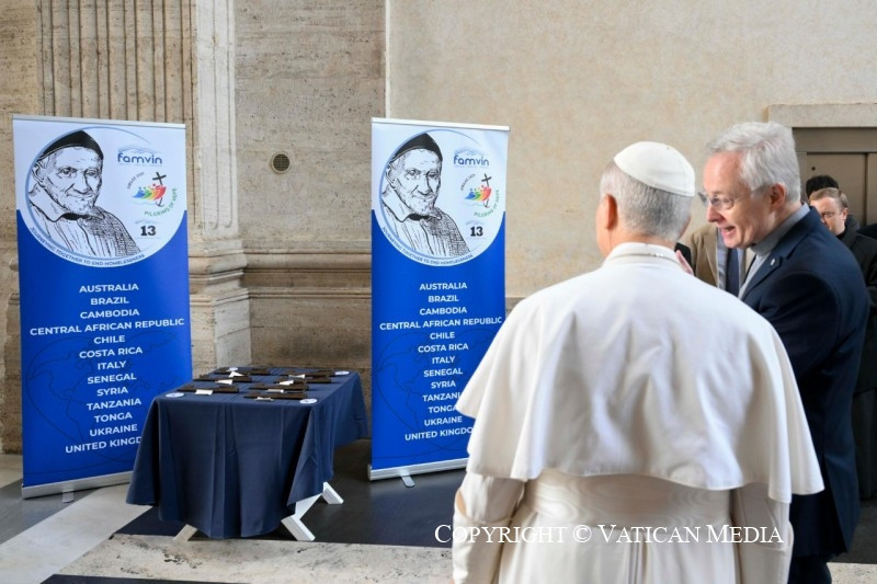 Szeretném kifejezni hálámat a szeretetszolgálat munkatársainak, a sok önkéntesnek, mindazoknak, akik a legszegényebbek helyzetének enyhítésével foglalkoznak, egyúttal szeretném arra bátorítani őket, hogy egyre inkább a társadalom kritikus lelkiismerete legyenek. Jól tudjátok, hogy a szegények kérdése hitünk lényegéhez vezet vissza, hiszen számunkra ők Krisztus saját teste, és nem csupán szociológiai kategória (vö. Dilexi te, 110). Ezért „az Egyház mint anya együtt halad mindazokkal, akik úton vannak. Ahol a világ fenyegetést lát, ott ő gyermekeit látja: ahol falakat emelnek, ő hidakat épít” (uo. 75).