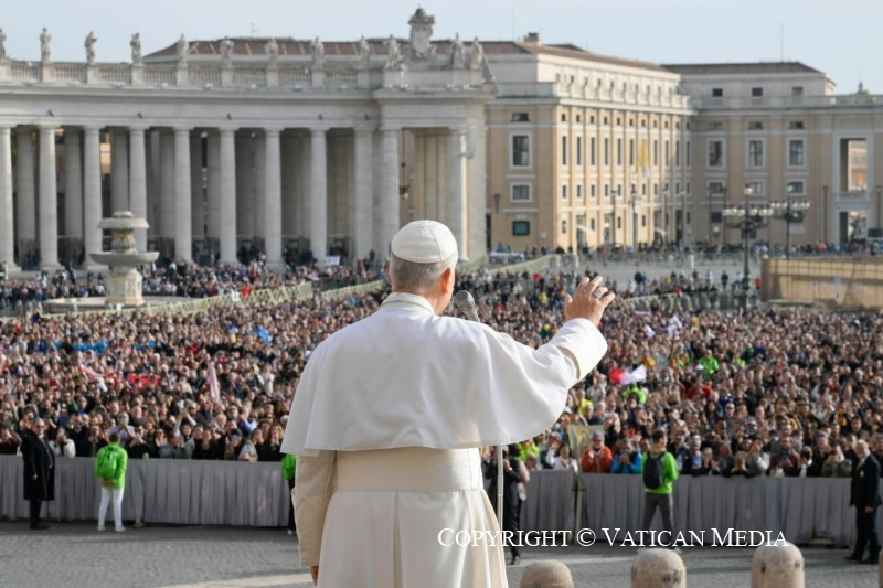 Amikor az evangéliumot olvassuk, az egyik jól ismert mondat így szól: „Boldogok a lélekben szegények, mert övék a mennyek országa” (Mt 5,3). Mi mindannyian az Úr szegényei közé szeretnénk tartozni, mert életünk Isten ajándéka, melyet nagy hálával fogadunk. Köszönöm nektek, hogy itt vagytok! A bazilika most kicsinek bizonyul… Ti az Egyházhoz tartoztok, és a kivetítőkről is követhetitek a szentmisét. Nagy szeretettel, nagy hittel vegyetek részt rajta, és tudjátok, hogy mind egyek vagyunk Krisztusban! Most tehát bemutatjuk a szentmisét, utána pedig találkozunk az Úrangyala elimádkozásakor itt, a téren. Isten áldjon meg mindnyájatokat! Szép vasárnapot!